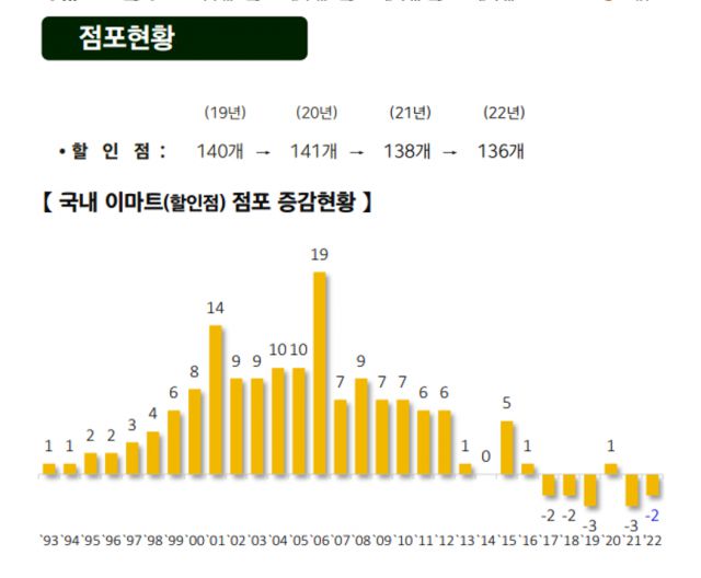 ‘운영 및 비용의 효율화’가 대형마트에는 더는 미룰 수 없는 과제인 측면도 있다. 온라인 커머스 확산으로 전통적인 오프라인 채널의 입지가 줄어든 데다 코로나 19를 계기로 심야 수요는 편의점과 배달 플랫폼에, 새벽 및 이른 아침 수요는 새벽·신선 배송에 특화한 e커머스에 흡수됐다. 실제로 산업통상자원부의 유통업체 연간 매출 동향에 따르면 전체 매출에서 이마트·롯데마트·홈플러스 등 대형마트 3사가 차지하는 비중은 2021년 15.7%를 기록, 16.0%인 편의점 3사(GS25·CU·세븐일레븐)에 밀렸다. 둘의 비중이 역전된 것은 산업부가 통계를 공표한 이래 처음이었다. 2022년 통계에서도 편의점(16.2%)이 대형마트(14.5%)보다 비중이 컸으며 둘 사이의 격차는 더 벌어졌다. 개별 마트들의 수익성이 점차 악화하는 상황에서 과감한 선택과 집중으로 마트에 대한 고객 수요가 높은 서비스를 강화해야 한다는 절박감은 커질 수밖에 없다.