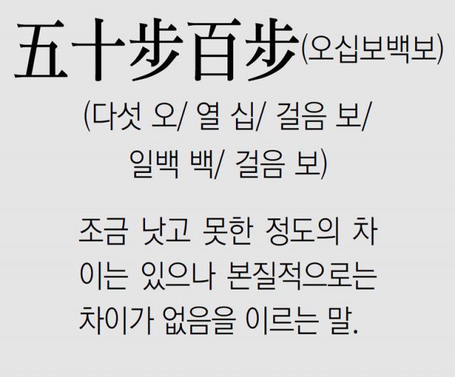 ● 유래: 맹자에서 유래한 성어입니다. 맹자가 위나라 양혜왕을 만났을 때 왕이 말하길 “과인은 나랏일에 온 마음을 다하고 있습니다. 하내(河內)에 흉년이 들면 그 백성들을 하동(河東)으로 이주시키고 식량을 하내로 옮기며, 하동에 흉년이 들면 역시 그렇게 하여 굶어 죽는 사람이 없게 하였습니다. 이웃 나라의 정사를 살펴보면 과인만큼 마음을 쓰는 왕이 없는데, 이웃 나라의 백성이 더 줄지 않으며 과인의 백성이 더 늘지 않는 것은 무엇 때문입니까?” 맹자가 대답하기를, “왕께서 전쟁을 좋아하시니 전쟁으로 비유를 들어 말하겠습니다. 지금 둥둥 북이 울리고 병기가 부딪치고 있는데, 갑옷을 버리고 병기를 끌고 도망을 가는 사람들이 있었습니다. 어떤 사람은 백 보를 달아나 멈추고 어떤 사람은 오십 보를 달아나 멈추었습니다. 오십 보 달아난 사람이 백 보 달아난 사람을 비웃는다면 어떻겠습니까?” 왕이 말하길, “옳지 않습니다. 백 보가 아닐 뿐이지 달아나기는 마찬가지입니다.” 맹자가 말하길, “왕께서 만일 이를 아신다면 백성이 이웃 나라보다 많기를 바라지 마십시오”.