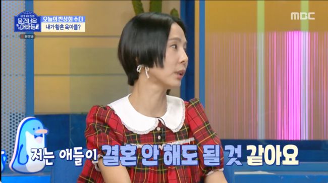 [OSEN=박근희 기자] '물 건너온 아빠들’ 김나영이 황혼육아를 언급하며, 자녀들이 결혼을 안해도 된다고 말해 웃음을 자아냈다.