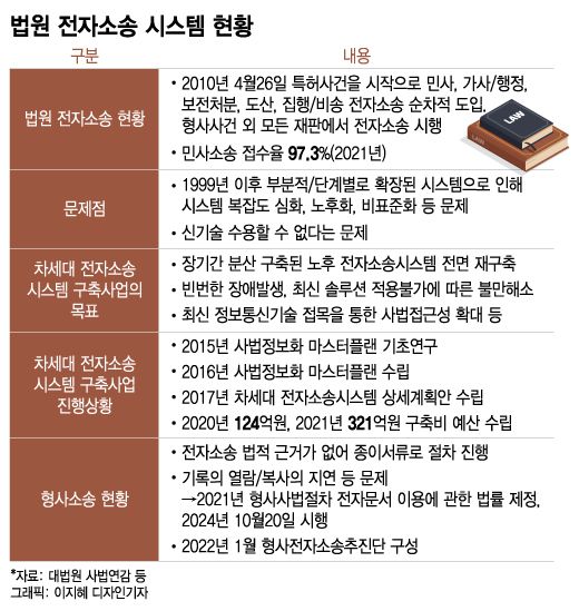법원의 '나의 사건검색' 서비스를 비롯해 공고·판결문 인터넷 열람 서비스 등이 지난 2~5일 두차례 먹통이 된 것을 계기로 법원 전산 시스템의 후진성이 다시 도마 위에 올랐다. 법원 시스템을 수시로 이용하는 검사, 변호사 등 법조인은 물론이고 일반 국민들 사이에서도 구시대적 법원 시스템의 문제를 지적하는 목소리가 이어진다.