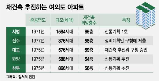 여의도 △공작 △광장(1·2동, 3~11동) △대교 △목화 △미성 △삼부 △삼익 △서울 △수정 △시범 △은하 △장미 △진주 △초원 △한양 △화랑 아파트가 대부분 1970년대에 지어져, 재건축 연한인 30년을 훌쩍 넘겼다.