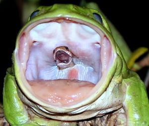 이 사진은 2011년 호주 노스 퀸슬랜드에서 촬영됐습니다. 거주민 줄리-앤 오닐은 당시 폭풍우가 몰려오고 있는 상황에서 주변의 야생동물들이 어떻게 행동하고 있는기 궁금해서 돌아다니다가 믿기 힘든 장면과 마주쳤습니다. 이 지역에서 흔하게 보이는 나무청개구리가 입을 쩍 벌리고 있었는데, 그 목구멍 사이에서 갈색 뱀 한마리가 어떻게든 빠져나오려고 안간힘을 쓰고 있었죠. 벌레를 주식으로 하는 이 개구리가 뱀마저 먹잇감으로 삼을 수 있다는 게 확인됐어요. 짐작컨대 개구리는 뱀의 꼬리부터 공략한 뒤 국수가락을 후루룩 넘기듯 머리끝까지 입속으로 집어넣는데 성공합니다. 뱀의 몸뚱아리 전체를 인수합병하기 직전 개구리는 마지막 자비심을 발휘해서 가련한 뱀에게 최후의 세상 구경을 시켜주려던 것일까요? 양서류의 두뇌 구조상 그런 감수성을 기대하기란 불가능합니다.