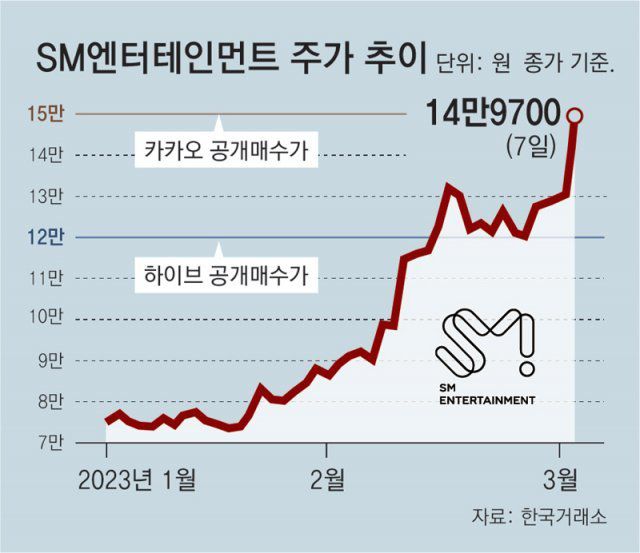카카오와 카카오엔터는 공개매수 가격으로 주당 15만 원을 제시했다. 공개매수는 26일까지 20일간 진행된다. 계획대로 진행되면 카카오와 카카오엔터는 에스엠 주식 매입에만 추가로 1조2500억 원을 투자하게 된다.