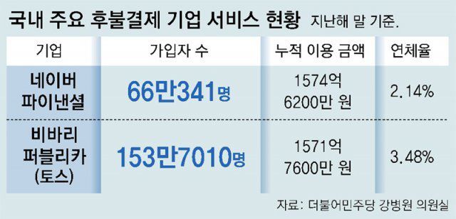 국회 정무위원회 소속 더불어민주당 강병원 의원실에 따르면 지난해 말 기준 후불결제 서비스 가입자는 토스 153만여 명, 네이버파이낸셜 66만여 명에 이른다. 또 양사의 누적 결제 잔액은 약 3146억 원으로 집계됐다. 토스 관계자는 “신용카드 사용이 어려운 청년과 주부 등에게 소액 신용결제 기회를 제공하면서 토스페이 서비스와의 시너지 효과를 만들고 있다”며 “전체 이용자의 절반가량이 20대 청년층”이라고 말했다.