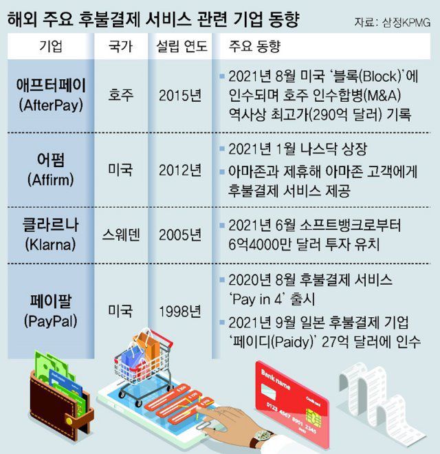 삼정KPMG가 지난달 발간한 ‘핀테크 산업 투자 동향과 주요 10대 트렌드’ 보고서는 ‘BNPL의 성장과 리스크 부상’을 글로벌 핀테크 산업의 주요 이슈로 꼽았다. 신용 이력이 없는 MZ세대나 신종 코로나바이러스 감염증(코로나19) 사태로 소득이 감소한 소비자를 중심으로 후불결제 서비스가 급증하고 있다는 것이다. 실제로 스웨덴 클라르나, 미국 어펌, 호주 애프터페이 등이 대표적인 후불결제 서비스로 꼽힌다. 어펌이 2021년 미국 나스닥에 상장할 정도로 성장한 가운데 미국을 대표하는 빅테크 애플도 ‘애플페이 레이터’라는 후불결제 서비스를 준비하고 있다.