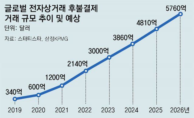 이런 흐름 속에 2019년 340억 달러(약 44조 원) 규모였던 글로벌 전자상거래 후불결제 거래액은 2020년 600억 달러(약 78조 원), 2021년 1200억 달러(약 156조 원) 등으로 계속 불어나는 추세다. 지난해엔 2140억 달러(약 278조 원), 2026년엔 5760억 달러(약 749조 원)에 이를 것으로 예상된다. 서지용 상명대 경영학과 교수는 “후불결제는 저신용자에게도 신용 거래의 길을 열어준다는 측면에서 의미가 있는 결제 방식”이라며 “서비스를 제공하는 기업들은 자신들의 전자상거래 사업을 키울 수 있다는 활용성이 부각되면서 글로벌 시장이 급성장하는 것”이라고 말했다.