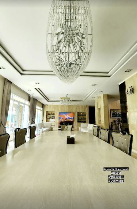 사진에는 집에 있는 신주아의 모습이 담겼다. 뒤로는 깔끔하고 고급스러운 인테리어가 돋보이는 부엌이 눈길을 끌었다. 특히 끝이 보이지 않을 정도로 길고 넓은 식탁과 화려한 샹들리에가 놀라움을 줬다.