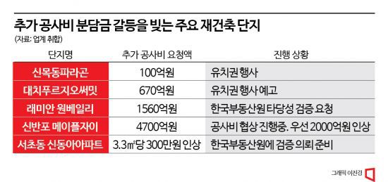 치솟은 금리와 건설 원자재 가격 급등에 따른 추가 공사비 분담 문제로 시공사와 재건축 조합 간 갈등이 곳곳에서 발생하고 있다. 입주가 시작된 목동의 한 단지는 공사비 증액을 요구하는 시공사가 분양자들의 입주까지 막는 상황이 벌어졌다. 또 입주가 임박한 강남의 한 단지는 시공사가 조합에 입주 제한을 고지하기도 했다.