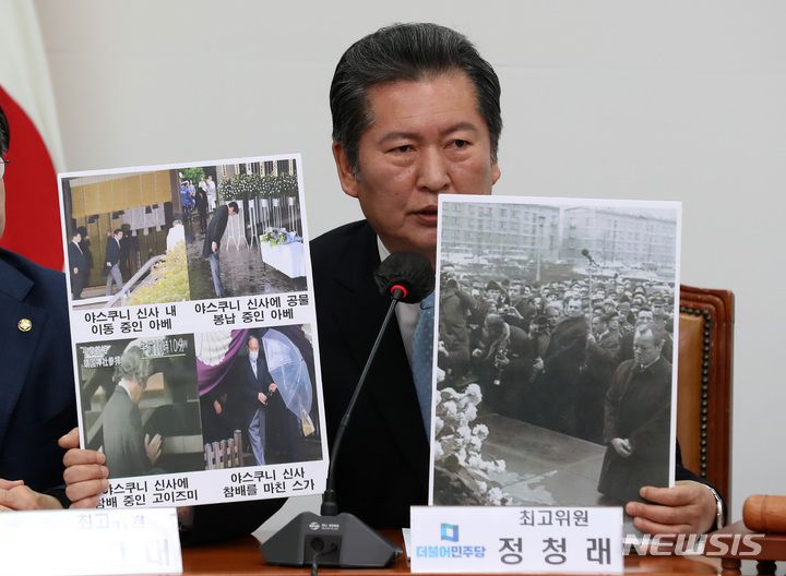 [서울=뉴시스] 이영환 기자 = 정청래 더불어민주당 최고위원이 8일 오전 서울 여의도 국회에서 열린 최고위원회의에서 전범국가 일본과 독일의 사진을 예로 들며 발언을 하고 있다. 2023.03.08. 20hwan@newsis.com