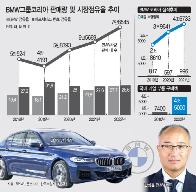BMW코리아에 따르면 지난해 BMW코리아가 한국 협력업체로부터 구매한 차량 부품액은 4조 5000억원이 넘었다. 이는 2021년 BMW코리아 전체 매출(4조6733억원)과 맞먹는 규모로, 한국에서 벌어들인 것 이상의 투자를 한 셈이다. 2010년부터 2022년까지 BMW코리아가 국내 협력업체로부터 구매한 부품 누적액은 25조원을 넘어선다.