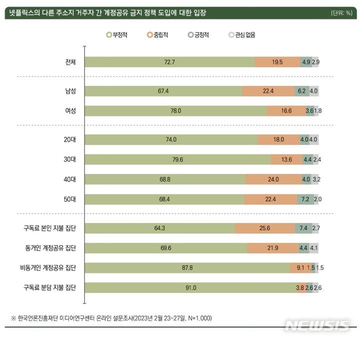 [서울=뉴시스] 한국언론진흥재단이 2월23~27일 넷플릭스 20~50대 이용자 1000명을 대상으로 조사한 결과, 응답자 72.7%가 넷플릭스 계정 공유 금지 조치에 대해 부정적 입장이었다. (자료=한국언론진흥재단 제공) 2023.03.09. photo@newsis.com *재판매 및 DB 금지 |