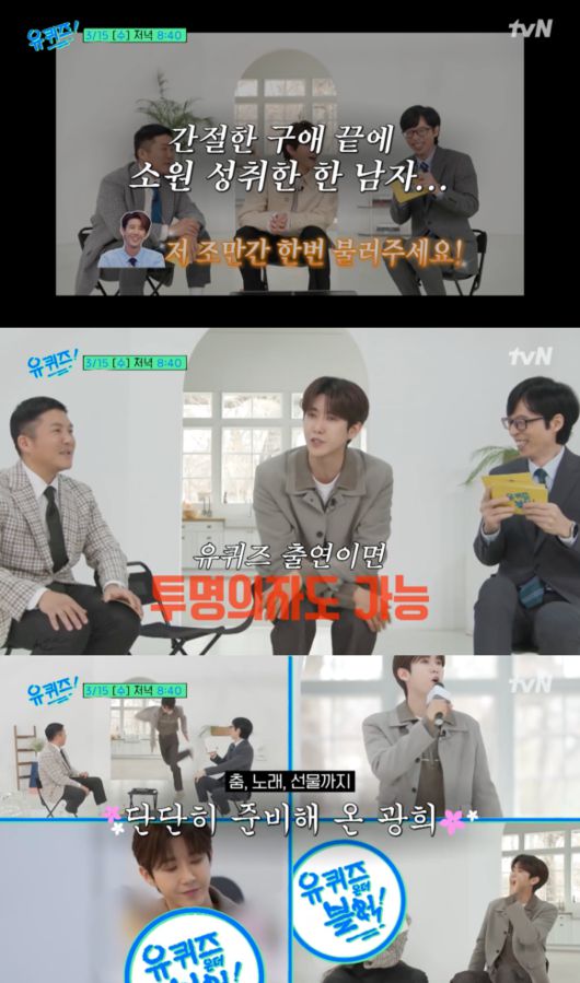 드디어 단독 게스트로 ‘유퀴즈’에 나온 광희는 신나는 마음을 맘껏 드러내며 “의자가 뭐가 필요하냐. 투명의자도 가능하다”고 말했고, 이어 준비해온 춤, 노래, 선물까지 공개해 유재석을 기쁘게 했다고.