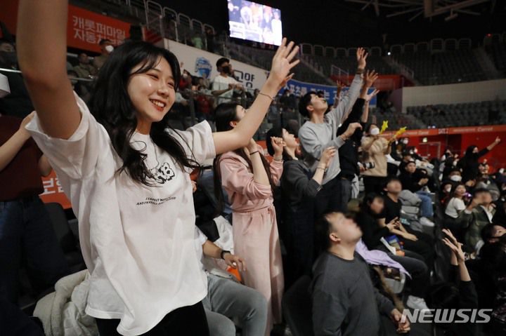 [고양=뉴시스] 조성우 기자 = 실내 마스크 착용 의무가 해제된 30일 오후 고양시 고양체육관에서 열린 2022-2023 프로농구 고양 캐롯과 서울 삼성의 경기에서 관중들이 응원을 하고 있다. 2023.01.30. xconfind@newsis.com |