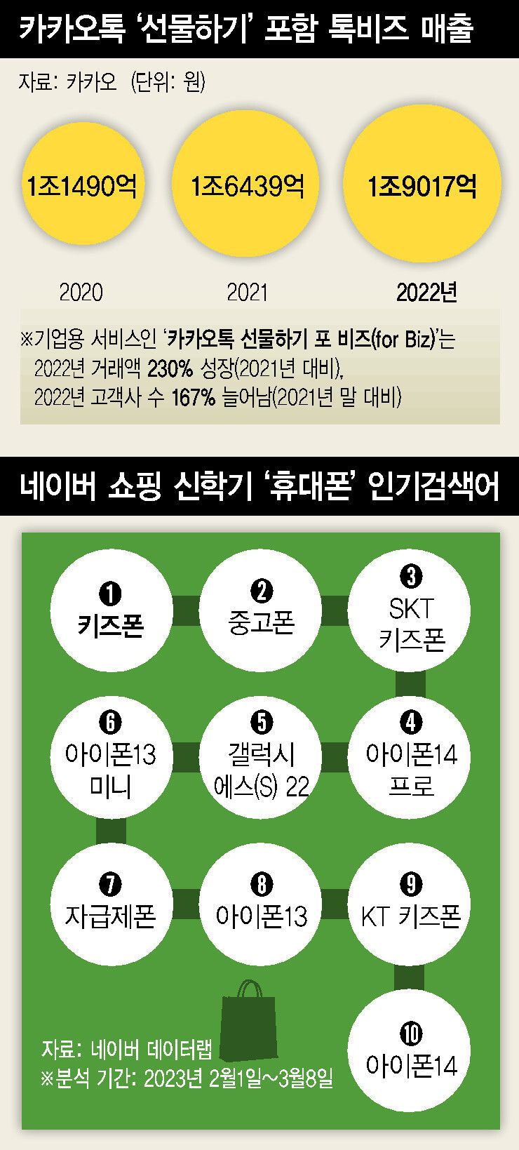 온라인으로 축하 인사와 함께 가볍게 선물을 주고받을 수 있는 ‘선물하기 플랫폼’ 시장도 계속 성장하고 있다. 특히 개인뿐 아니라 기업이 직원이나 거래처에 보내는 ‘선물하기’ 서비스도 기능을 개선하며 시장을 넓히고 있다. 카카오톡의 ‘선물하기’를 포함하는 ‘톡비즈 매출’은 2020년 1조1490억원에서 2022년 1조9017억원으로 증가했다.