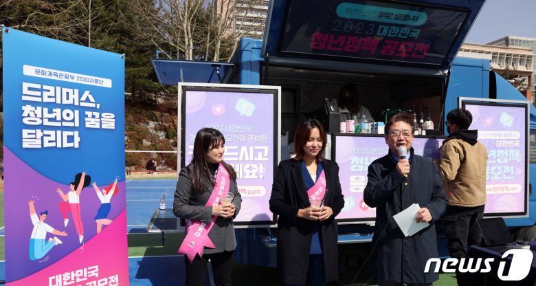 (서울=뉴스1) = 박보균 문화체육관광부 장관이 13일 서울 성북구 국민대학교 중앙광장에 마련된 '2023 대한민국 청년정책' 공모전 홍보 커피트럭에서 학생들에게 청년정책 공모전에 대한 홍보를 하고 있다.(문화체육관광부 제공) 2023.3.13/뉴스1photo@news1.krCopyright ⓒ 뉴스1. All rights reserved. 무단 전재 및 재배포 금지.이 기사의 카테고리는 언론사의 분류를 따릅니다.0공유하기