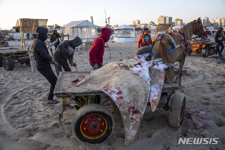 [가자지구=AP/뉴시스] 지난 12일(현지시간) 팔레스타인 어부들이 가자 지구 해변에서 잡은 만타가오리를 마차로 옮기고 있다. 가자지구 어부들은 겨울철 이주기 동안 해안선을 따라 이동하는 멸종위기종인 만타가오리를 포획하고 있다. 어부들은 이 가오리가 보호종인 것은 알고 있지만 이스라엘이 승인한 어업구역의 제한으로 선택의 여지가 없다고 주장하고 있다. 가난한 가자 주민들은 단백질 섭취를 위해 ㎏당 약 3달러로 저렴하게 판매되는 이 가오리를 사 먹는 것으로 알려졌다. 2023.03.14.