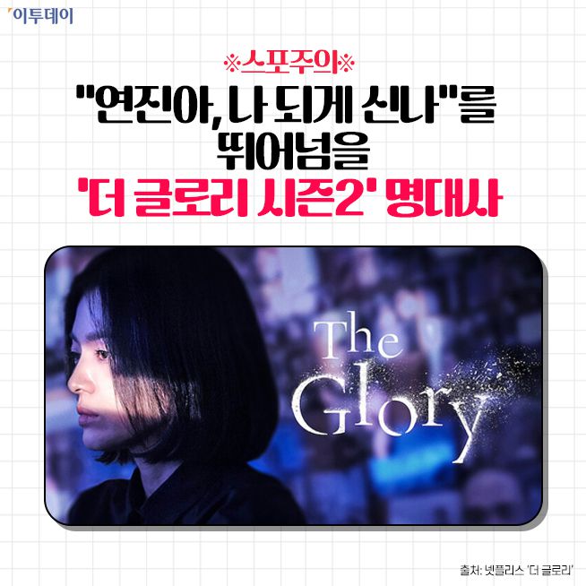 ‘더 글로리’의 인기는 이제 시작인 셈인데요. 처절한 피해자의 완벽한 복수극. 또 천천히 그리고 단단하게 쌓아 올린 과정에 열광하게 되는 건 한국 시청자뿐만이 아니죠. 전 세계 시청자들을 소름 돋게 한 그들의 멋진 대사를 오늘도 다시 곱씹어 봐야겠습니다.
