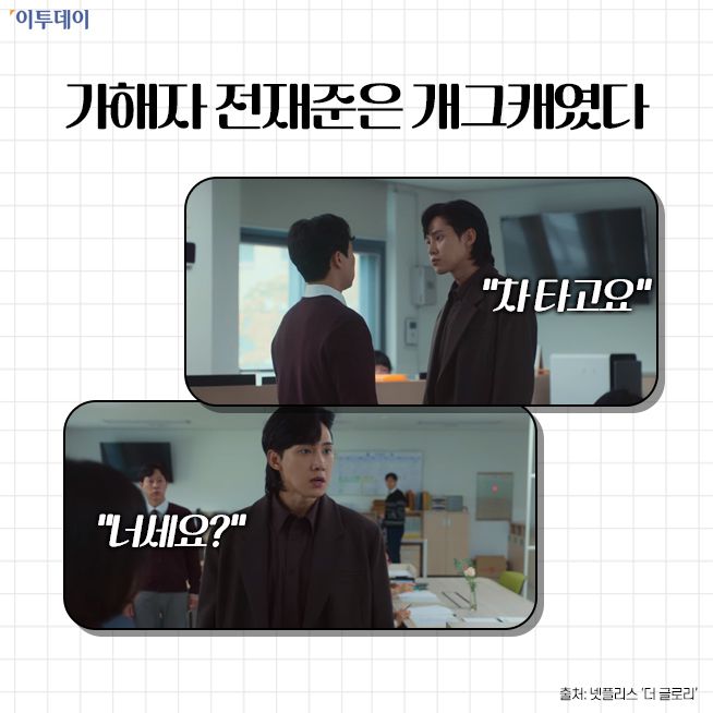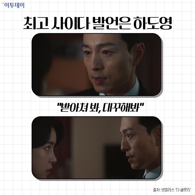 일명 나이스한 개XX라 불렸던 하도영의 진면목이 그대로 드러난 대사가 아닐까 싶은데요. 연진 패거리들이 입에 달고 사는 상스러운 욕도 아닌데 마치 엄청난 욕을 들이부은 느낌. 고급스러우면서도 상대를 깔아뭉개는 그 나이스함을 아는 듯한 대사가 그저 소름이죠. 온라인 커뮤니티 곳곳에서 “받아쳐 봐. 대꾸해봐”가 언급되며 진정한 사이다는 하도영이었다고 입을 모으고 있습니다.