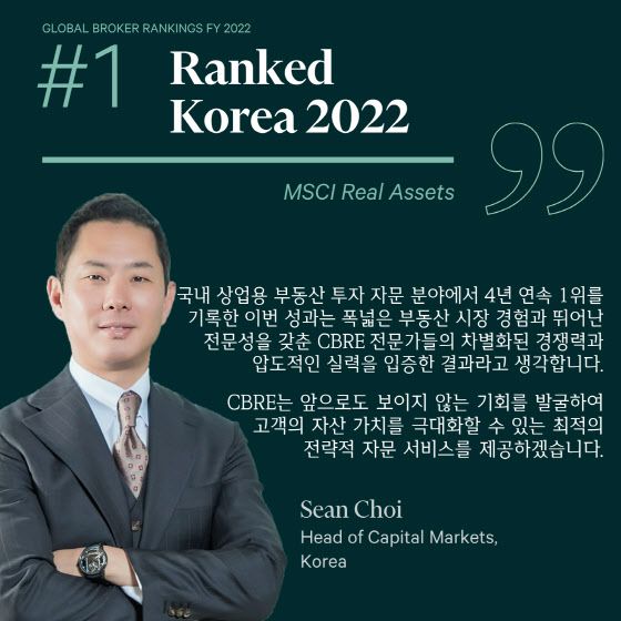 MSCI 리얼에셋에 따르면 CBRE 코리아는 작년 국내 상업용부동산 투자자문 분야에서 시장 점유율 32.5%를 기록했다. 이에 오피스(32.4%), 리테일(54%) 등 주요 부동산 매각 자문에서 1위를 차지했다.