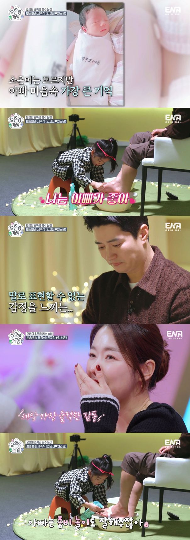 인교진은 "방송에서 그만 좀 울으라 그래서 꾹 참고 잘 한 거 같다. 들으셨을지 모르겠지만, 발 씻어주면서 '나는 아빠가 좋아'라는 말을 들었을 때 절대 그런 말을 자주 하는 아이가 아닌데 아빠 발 깨끗하다고 하면서. 그러니까 마음이.."라면서 울컥해했다.