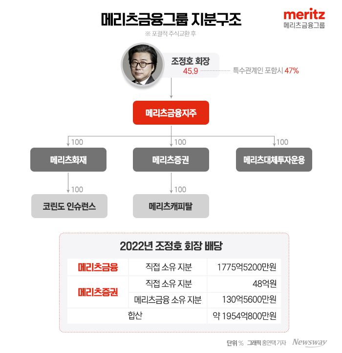 증권과 보험사를 완전 자회사로 편입하는 메리츠금융지주의 지배구조 개편은 조정호 그룹 회장에게 최상의 선택이라는 분석이 지배적이다. 표면적으로 지분율이 50% 아래로 떨어지지만 배당과 자사주 매입·소각 카드를 제대로 활용하면 조 회장의 그룹 지배력은 더욱 공고해질 것이기 때문이다.