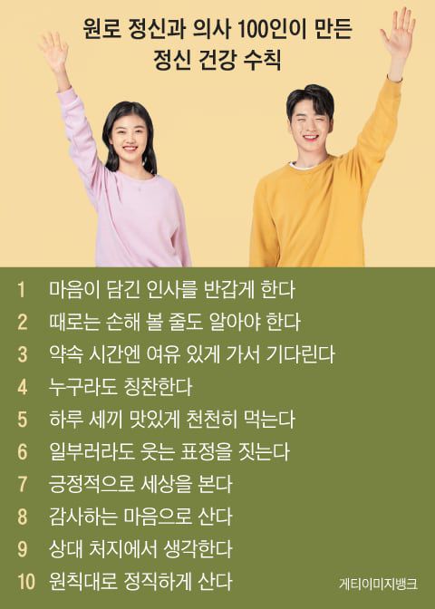 20년 전 우리 사회가 지식정보화 사회로 접어들 때, 원로 정신과 의사 100인이 모여 정신건강 수칙을 만들었다. 이 수칙이 정신질환이 만연한 요즘에 새삼 주목 받으며, 건강 관련 단체나 홈페이지에 소개되고 있다.