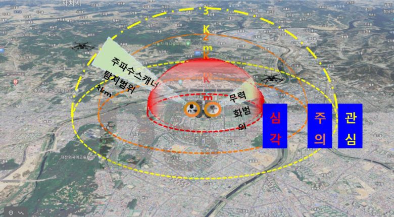 정부대전청사를 기점으로 반경 3㎞내 모든 드론을 탐지한다. 1㎞이 내로 접근하는 드론을 무력화하는 인프라를 갖출 예정이다. 드론 접근 거리에 따라 관심(3㎞), 주의(2㎞), 심각(1㎞)으로 구분하고, 심각 단계 이내로 접근 시 시스템이 본격 가동된다.