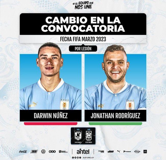 우루과이 축구협회는 18일(한국시간) 공식 채널을 통해 "누녜스가 부상을 입어 이번 A매치 기간에 소집되지 않는다. 대신 조나단 로드리게스가 발탁됐다"고 전했다.