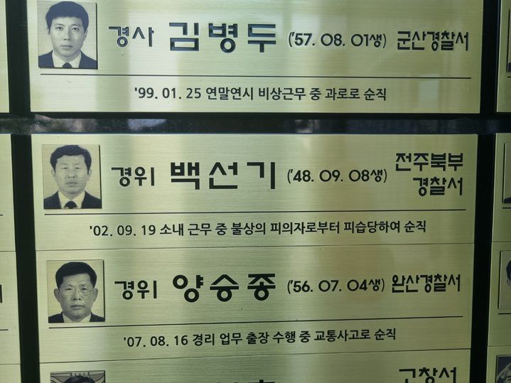 [전주=뉴시스]최정규 기자 = 전북경찰청 추모의 벽에 있는 백선기 경사. *재판매 및 DB 금지