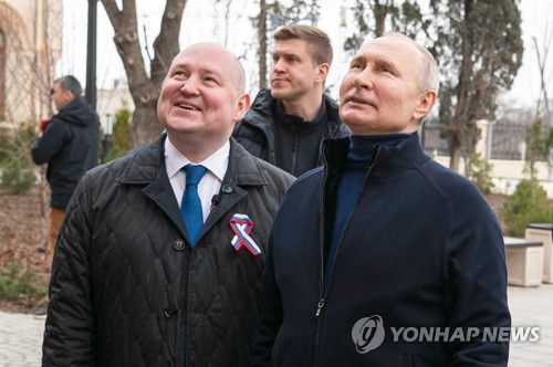 크림반도 예고 없이 방문한 푸틴 대통령(세바스토폴 타스=연합뉴스) 블라디미르 푸틴 러시아 대통령이 18일(현지시간) 크림반도 남서부 항구도시 세바스토폴을 방문해 미하일 라즈보자예프 시장의 안내를 받으며 어린이 예술공예센터를 둘러보고 있다. 2023.03.18 photo@yna.co.kr