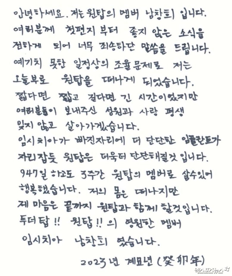 남창희는 "좋지 않은 소식을 전하게 되어 너무 죄송하단 말씀을 드립니다"라고 사과했다. 이어 그는 "짧다면 짧고 길다면 긴 시간이었지만 여러분들이 보내주신 성원과 사랑 평생 잊지 않고 살아가겠습니다"라며 감사를 표했다.