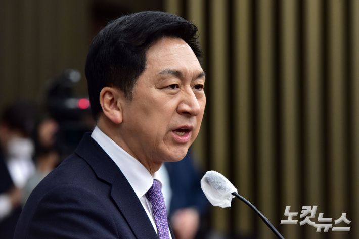 국민의힘 김기현 대표가 16일 서울 여의도 국회에서 열린 정책 의원총회에서 발언을 하고 있다. 윤창원 기자 |