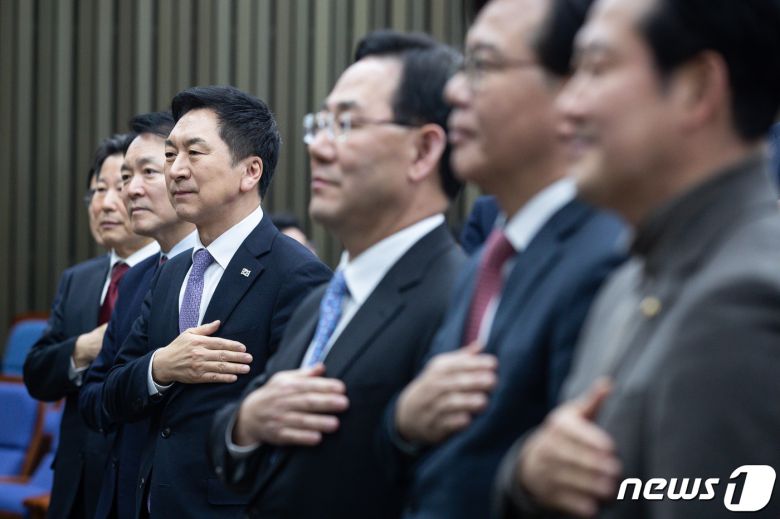 김기현 국민의힘 대표를 비롯한 지도부가 16일 서울 여의도 국회에서 열린 정책의원총회에서 국민의례를 하고 있다. 2023.3.16/뉴스1 ⓒ News1 유승관 기자