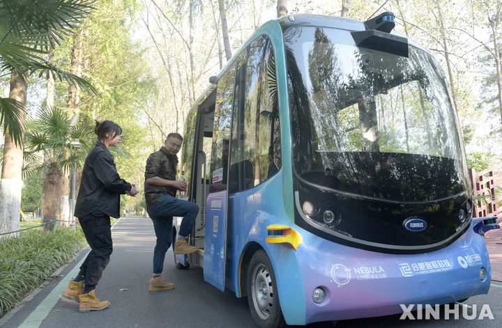 [허페이(중국 안후이성)= 신화/뉴시스] 중국 안후이 성의 빈후 국립공원 안에서 관광객들이 무인 자율주행 버스에 탑승하고 있다. 중국 정부는 바이두, 포니 아이등 2개 회사에 3월17일 완전 무인 차량의 베이징 경제 특구내 공용도로 시험주행을 허가해 향후 무인차 운행시대를 예고했다.