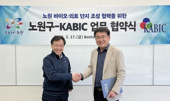 노원구(구청장 오승록)가 현지 시각 17일 오후 4시 미국 보스턴에서 바이오 분야 전문가 그룹인 재미한인바이오산업협회(KABIC)와 업무협약을 맺었다고 밝혔다.