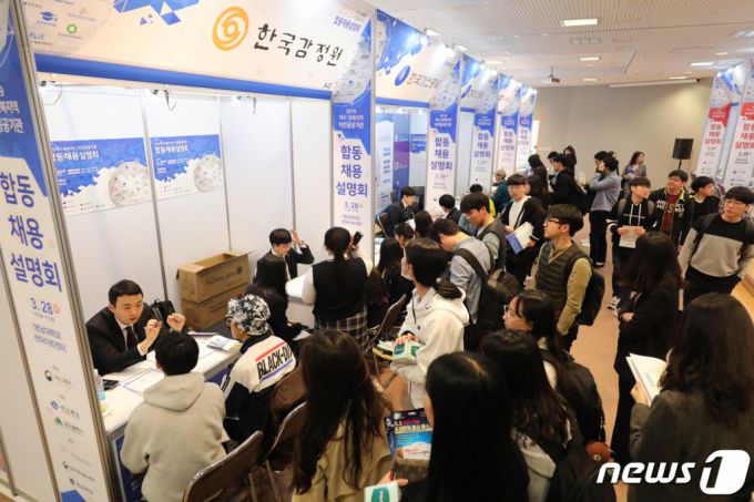 (경산=뉴스1) 공정식 기자 = 28일 경북 경산시 영남대 천마아트센터에서 열린 ‘2019 대구·경북 이전 공공기관 합동채용설명회’에서 취업준비생들이 공공기관과 기업 채용 상담부스를 찾아 인사담당자와 상담하고 있다. 국토교통부 주최, 대구시·경상북도 주관, 영남대·대구지방고용노동청 후원으로 열리는 이번 합동채용설명회는 한국감정원과 한국가스공사 등 대구·경북으로 이전한 공공기관을 비롯해 대구은행과 영남대 등 30여 개 기업과 대학이 참여한다. 2019.3.28/뉴스1 |