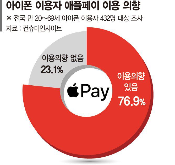 20일 업계에 따르면 애플페이를 두고 아이폰 이용자들의 기대감이 높아지고 있다. 소비자리서치 전문 연구기관 컨슈머인사이트 설문 결과(전국 20~69세 432명 대상)에 따르면 아이폰 이용자의 76.9%가 애플페이 '이용 의향이 있다'고 답한 것으로 나타났다.