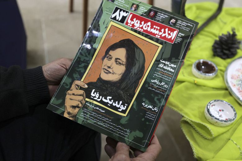 14일(현지시각) 이란 테헤란에서 한 시민이 마흐사 아미니의 얼굴이 그려진 이란 잡지를 들고 있다. 평범한 이란 여성이었던 아미니는 지난해 9월 히잡 착용 미비로 도덕경찰에 붙잡혔다 숨지면서 이란 전역에서 자유와 저항을 상징하는 인물이 됐다. 테헤란/AFP 연합뉴스