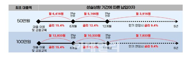 금리는 최초 대출 시 연 15.9%이나 금융교육을 이수하면 금리가 0.5%포인트(p)인하돼 원금 50만원을 적용하면 이자는 월 6416원으로 줄어든다. 또 이자를 성실하게 6개월 납부하면 금리가 3%p씩 또한번 인하돼 6개월 후에는 5166원, 추가 6개월 후에는 3916원으로 금리부담이 더 경감된다.