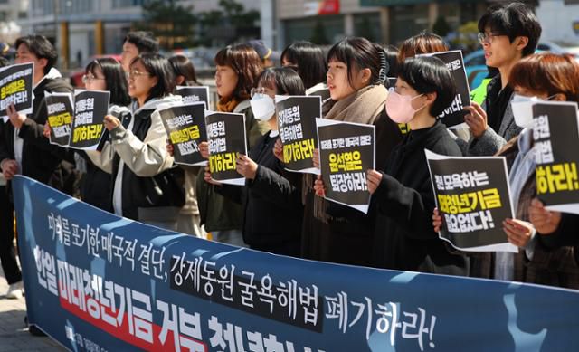 16일 오후 서울 용산 대통령실 앞에서 '2015 한일합의 파기를 위한 대학생 공동행동' 관계자들이 일제 강제징용 피해배상 문제와 관련해 양국 재계가 조성하기로 한 '미래청년기금' 거부 청년학생 입장 발표 기자회견을 하고 있다. 연합뉴스 |
