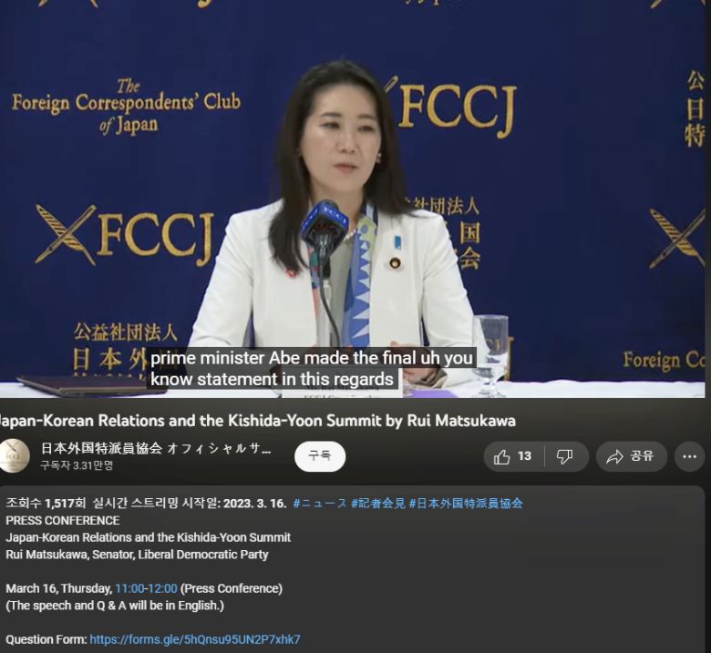 일본 내 외국 특파원들과 마쓰가와 의원의 질의응답이 있었던 날은 윤석열 대통령이 일본을 방문해 기시다 후미오 일본 총리와 한일 정상회담을 가진 당일이다. 한국 대통령이 강제동원 배상안을 들고 일본을 직접 찾아간 날에도 일본은 강제동원과 관련한 인식 차이를 내보인 것이다.
