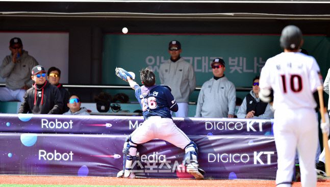 두산 포수 박유연이 21일 수원KT위즈파크에서 열린 2023KBO리그 시범경기 KT위즈와 두산베어스의 경기 1회말 2사 2루 KT 5번타자 황재균의 파울플라이를 KT 덕아웃에서 잡아내고 있다. 2023.03.21.