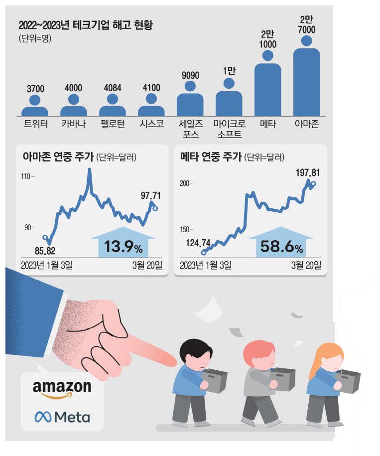 지난 1년간 미국 테크기업이 10만명 가까운 직원을 해고한 가운데 메타에 이어 아마존도 1만명 수준의 2차 구조조정을 또 발표했다. 두 기업이 각각 2만명 넘는 직원을 해고한 셈인데, 이 같은 감원 발표로 메타는 주가가 오른 반면, 아마존 주가는 하락했다. 최근 테크기업 감원은 일반적으로 인건비 축소·조직 효율화로 해석돼 주가에 긍정적이지만 아마존의 감원은 핵심 사업인 클라우드와 광고 부문 중심이라는 점에서 충격으로 여겨진 것으로 보인다.
