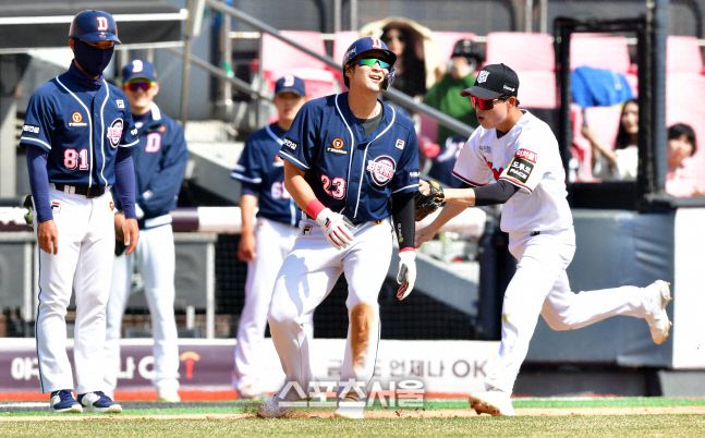 두산 3번 강승호가 21일 수원KT위즈파크에서 열린 2023KBO리그 시범경기 KT위즈와 두산베어스의 경기 3회초 2사 2루 두산 4번 김재환의 내야땅볼때 수비실책이 일어난 사이 홈으로 향하다 3-홈간 협살에 걸려 아웃되고 있다. 수원 | 강영조기자 kanjo@sportsseoul.com
