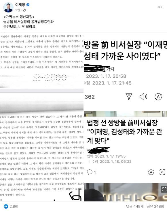 앞서 이 대표는 지난 19일 자신의 페이스북에 '가짜뉴스 생산과정'이라는 제목으로 "쌍방울 비서실장의 공개 법정 증언과 증언 보도. 너무 달라요"라는 글과 함께 쌍방울 전 비서실장 A씨의 증인신문조서 일부를 찍은 사진을 첨부했다.