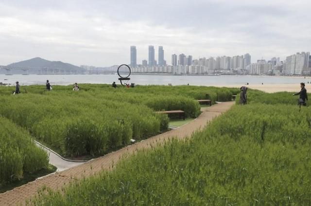 완연한 봄 날씨를 보인 21일 부산 수영구 광안리해수욕장 옆 민락해변공원에 시민들이 초록으로 물든 청보리밭 옆을 지나고 있다.