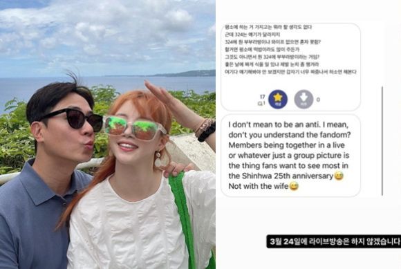 이와 함께 신화 팬 커뮤니티에 올라온 것으로 보이는 게시물을 캡처해 보냈다. 게시물에는 "평소 하는 것 가지고 뭐라고 할 생각 없다. 그런데 324는 이야기가 달라진다. 324에 무슨 부부 라방이냐. 제발 눈치 좀 챙겨라"는 내용이 담겨 있다.