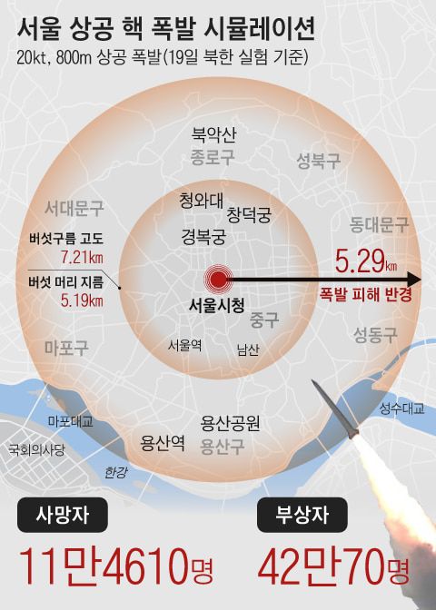 북한이 지난 19일 동해 상공 800m에서 모의 핵탄두 폭파에 성공했다고 주장한 핵 미사일이 위력 20kt의 핵탄두를 탑재하고 같은 높이의 서울 상공에서 폭발할 경우 11만4600여 명이 사망하는 등 53만4600여 명의 사상자가 발생한다는 시뮬레이션 결과가 21일 나왔다.