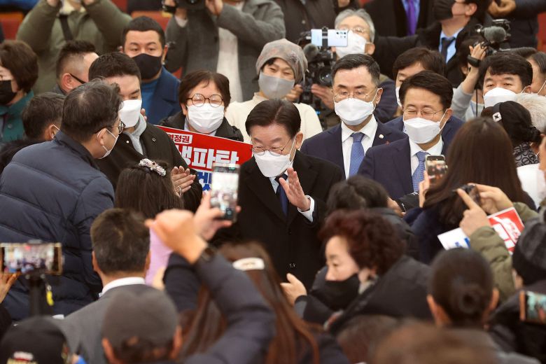 이재명 더불어민주당 대표와 당 지도부가 지난해 12월 27일 전남 무안군 남악복합주민센터에서 열린 찾아가는 국민보고회 전남 편에서 참석자들의 환호를 받고 있다./뉴스1
