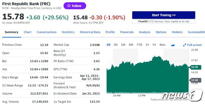 21일(현지시간) 뉴욕증시에서 퍼스트 리퍼블릭은 전거래일보다 29.56% 폭등한 15.78달러를 기록했다.